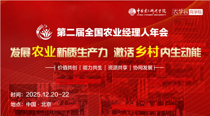12月20日至22日,第二届全国农业经理人年会在北京圆满举办。本次年会由中国农民研修学院主办,农业农村部管理干部学院、中国农业大学继续教育学院、北京农业职业学院等多所院校,以及中国城镇化促进会、中国国土经济学会、中国职业经理人协会等多家社会组织联合支持,以“发展新质生产力,激活农业新动能”为核心主题,通过研学考察、政策解读、主题报告、圆桌对话、典型表彰等多元形式,为全国农业经理人搭建了集学习提升、交流合作、共谋发展于一体的高端平台,助力农业人才队伍建设,为全面推进乡村振兴注入强劲动力。